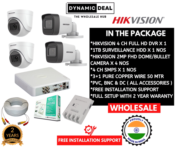 CCTV SETUP-HIKVISION 4 CH FHD DVR ,2MP FULL HD CAMERA X 4 NOS, 1TB SURVEILLANCE HDD, ALL ACCESSORIES