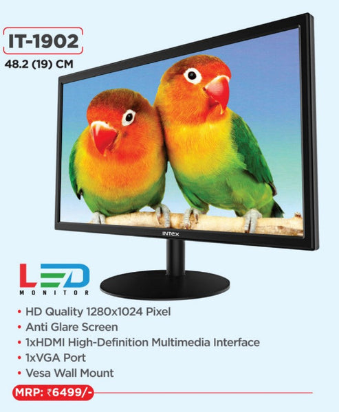 HD Quality Display Vesa Wall Monut High Brightness Anti Glare Screen  The IT-1902 LED Monitor features a 42.2 cm anti glare screen featuring high brightness and HD qality display so you can access all your favorite effortlessly.  1 Year Intex...View more