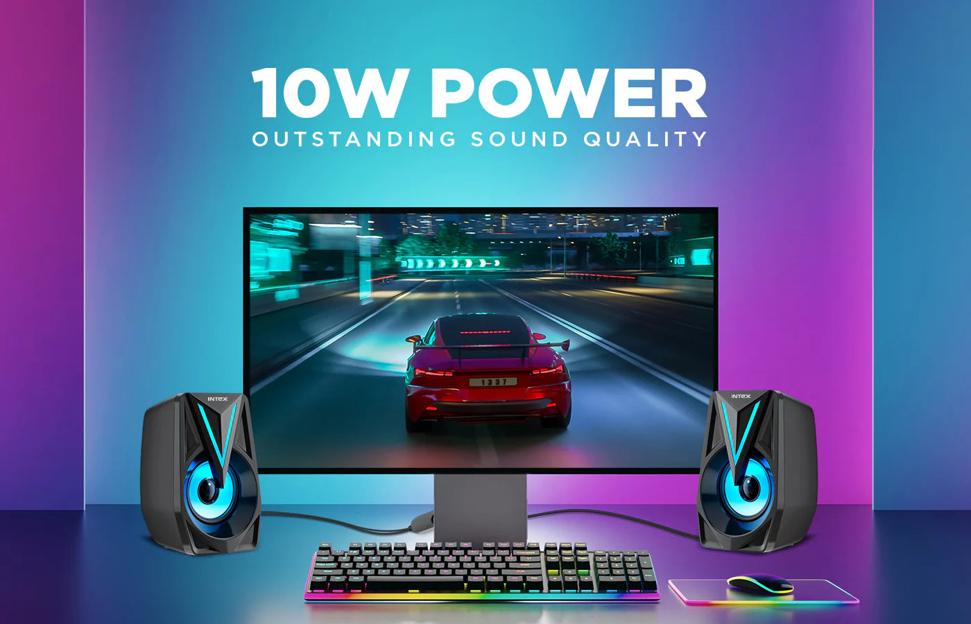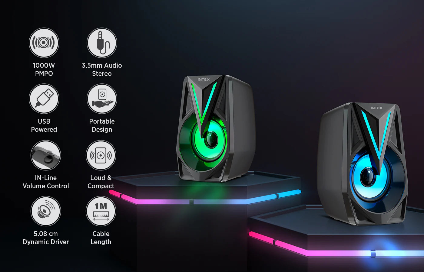 Elevate your desktop audio experience with the Intex IT 125 – a compact, stylish speaker delivering clear 10W sound, deep bass, and enhanced by multiple mesmerizing RGB LED lights. With versatile connectivity options, including AUX and USB, and an in-line volume controller for added convenience, it's the perfect upgrade for your workspace.
